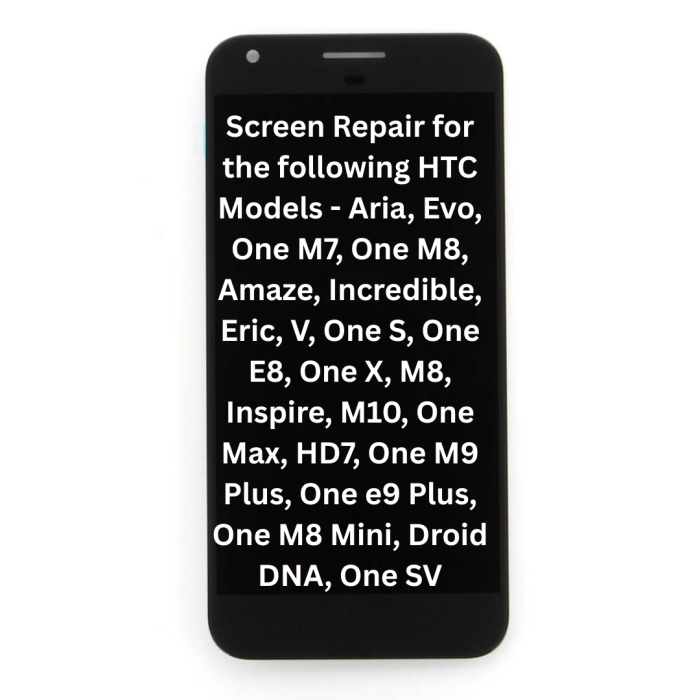 Screen Repair for the following HTC Models - Aria, Evo, One M7, One M8, Amaze, Incredible, Eric, V, One S, One E8, One X, M8, Inspire, M10, One Max, HD7, One M9 Plus, One e9 Plus, One M8 Mini, Droid DNA, One SV